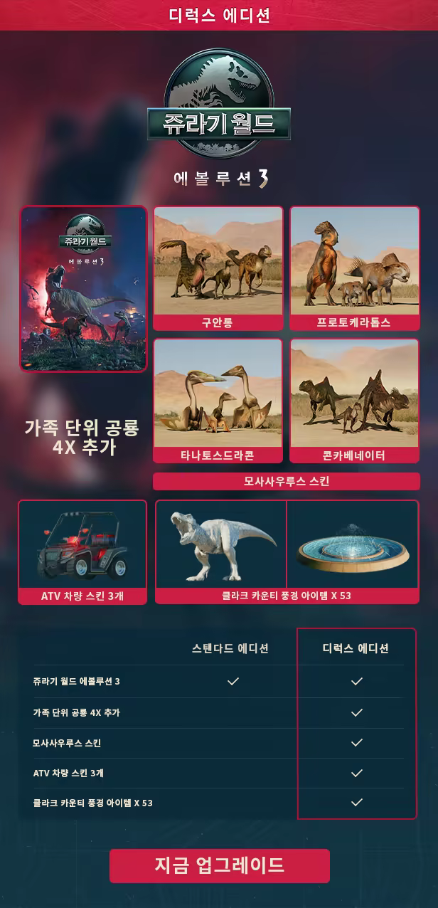 쥬라기 월드 에볼루션 3: 디럭스 에디션을 구매하세요. 모사사우루스 스킨, 클라크 카운티 특별 풍경, 유지보수 및 수리 팀의 ATV 스킨 3종이 포함되어 있습니다.