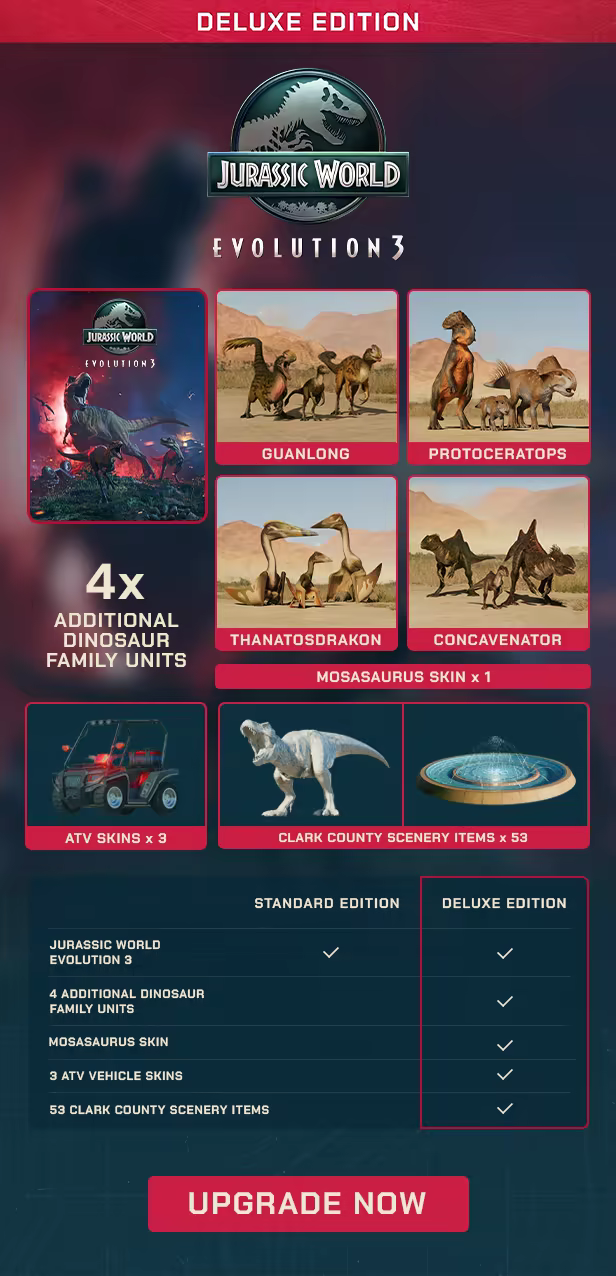 Kupte si Jurassic World Evolution 3: Deluxe Edition, která obsahuje skin Mosasaura, unikátní scenérii z Clark County a tři skiny čtyřkolek pro tým údržby a oprav.