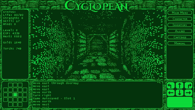Cyclopean follows the tradition of early CRPGs like Ultima, Questron, and Legacy of the Ancients (among others) in that it presents two differing views of the game world.  Outside of dungeons, you see your character from the top down in a 2D display of the map.  Whereas, in dungeons, the view changes to a 3D, first person perspective.