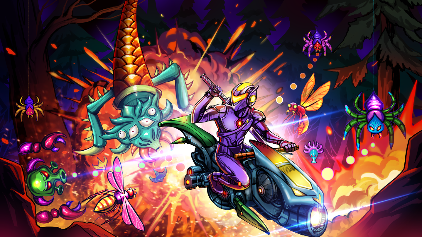 跳上你的飞行摩托车,一路风驰电掣,展开无限制的忍者主题弹幕射击大混战!