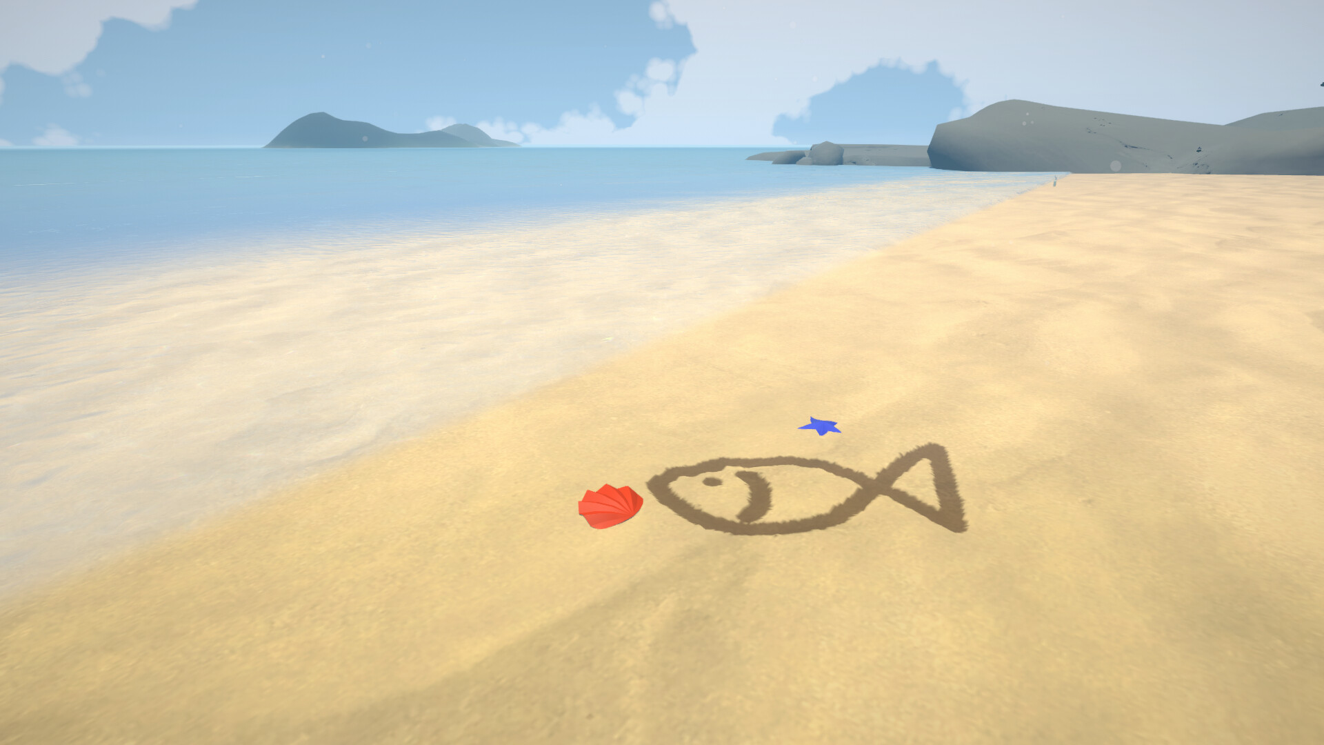 Let's enjoy your own personal beach. Wander around at your leisure and use a branch to draw in the sand. What will you draw in the short time you have before the sea washes it away? The time-of-day changes as you draw, bringing you relaxation, and perhaps new discoveries...