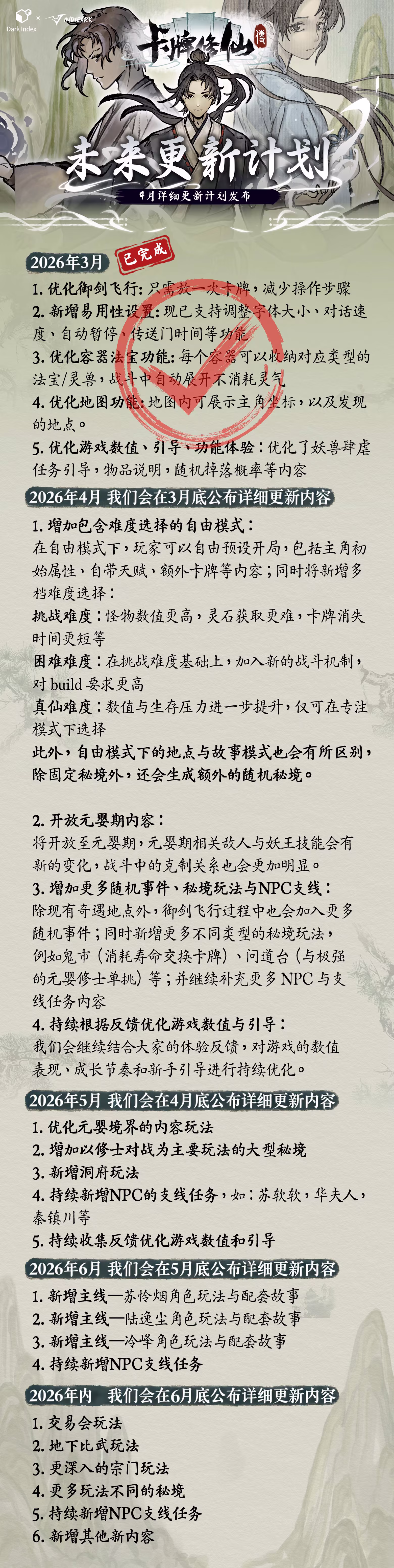 《卡牌修仙传》是一款水墨风格,修仙题材的卡牌管理游戏。玩家将扮演一名失去记忆的修仙者,在自由游历世界的同时,修炼自身,探索秘境,打造法宝,惩奸除恶,以找回失去的记忆,并以自己的方式飞升仙界。