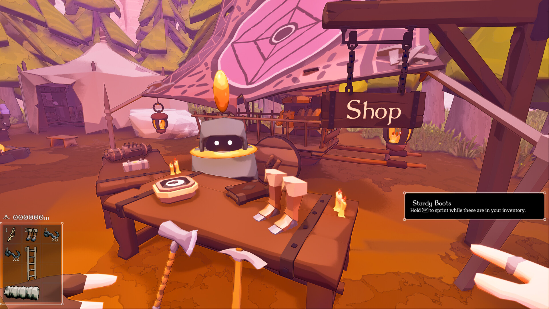 A storm approaches on the horizon. You see a tower on the next ridge. It must have something of value to be constructed in such a harsh place. Do you risk it and scale over? Can you reach it and descend before the storm hits? You could also play it safe. Stop and stash some equipment here to come back more prepared the next time.