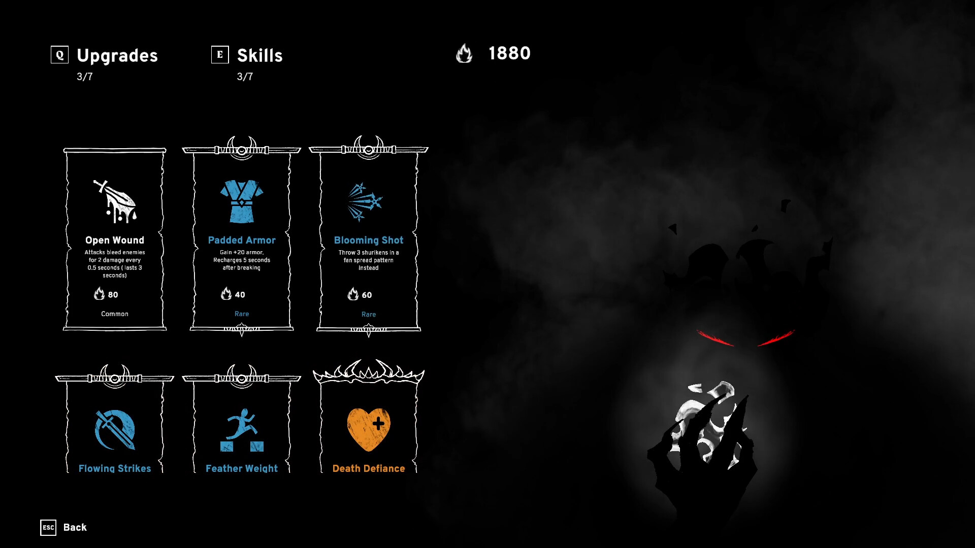Skill upgrades - You can upgrade your senses to enhance your blind fighting or discover demonic powers from your patron!