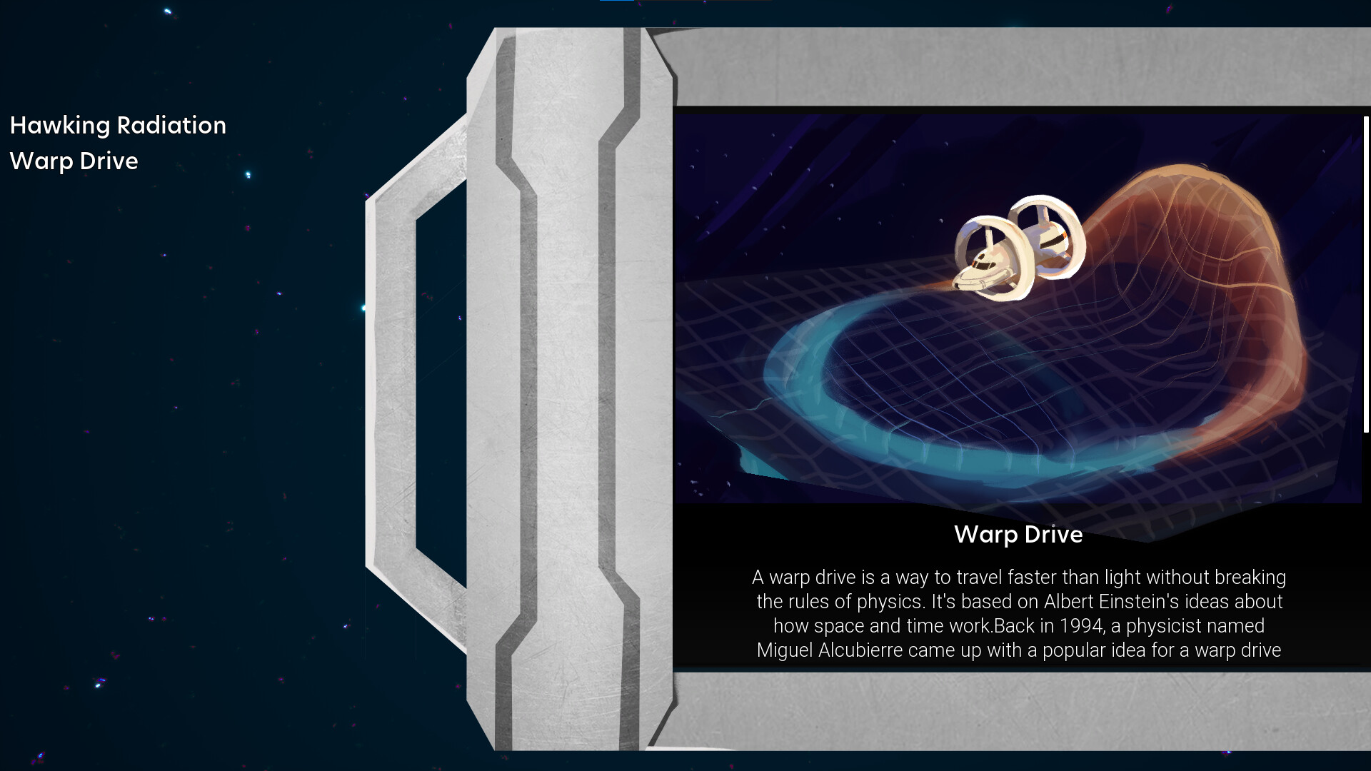 As you explore, discover detailed entries in the "Educational Journal", which cover fascinating cosmic phenomena like "Hawking Radiation", "Warp Drive", "Proton Decay” and many others. These entries not only enrich the game's lore but also provide educational insights into the mysteries of the universe.