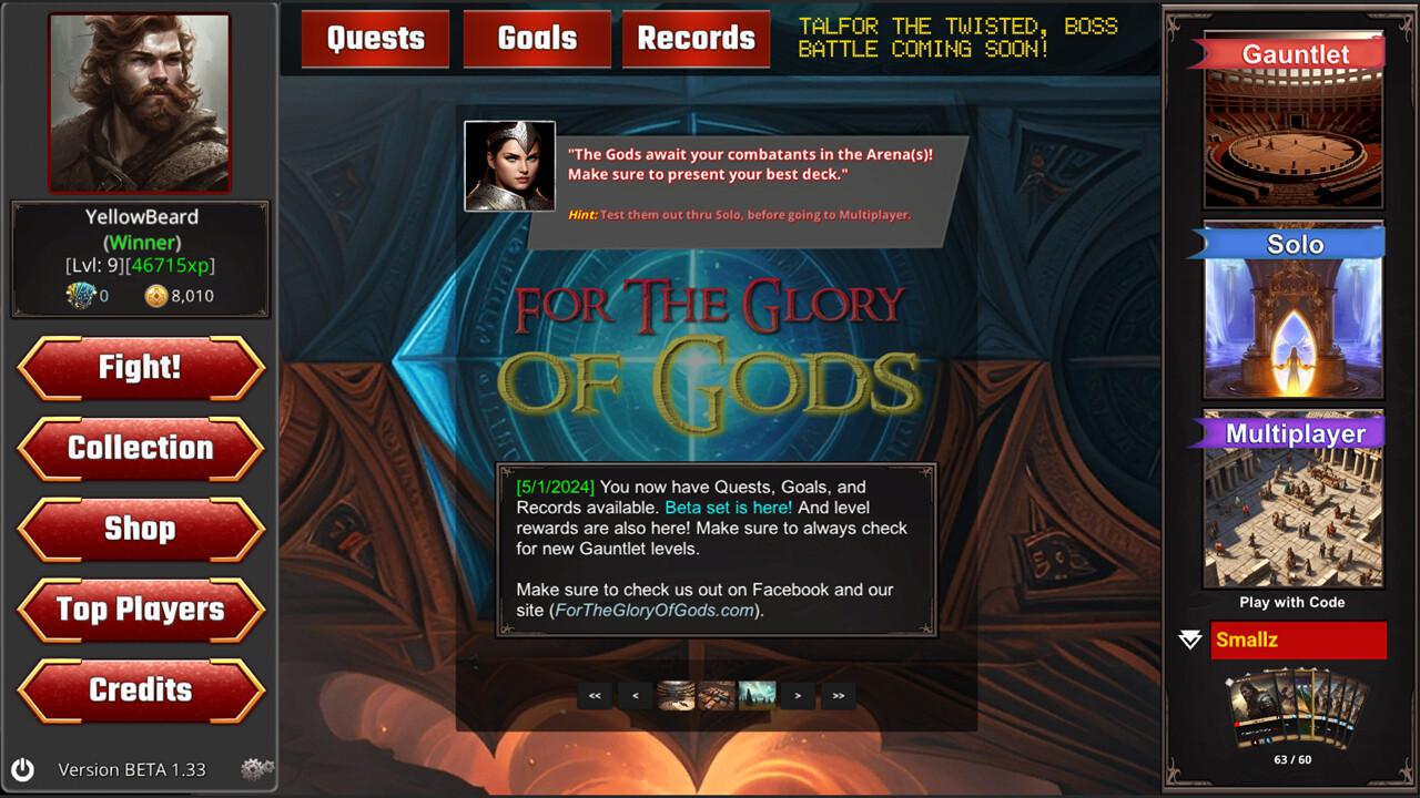 An alternative online trading card game that allows unlimited deck-building and competitors, both AI and live! Three different game modes that include Gauntlet, Solo, and Multiplayer options. Many player and deck customization options to earn and choose from. From Daily/Weekly Quests and Goals, to Login Rewards, Records, and Leaderboards, there is plenty of ways to earn, brag about, and immortalize yourself For the Glory of Gods!