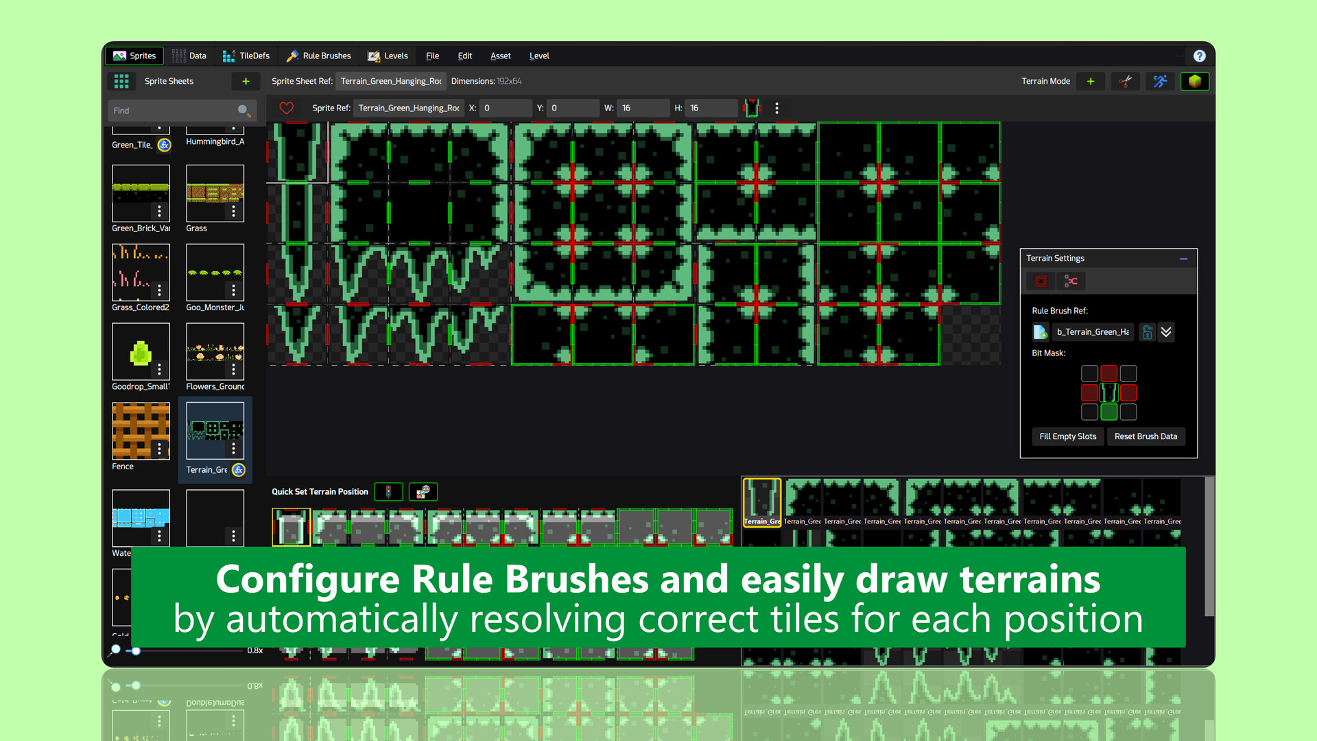 Import and slice your sprite sheets, remove opaque backgrounds by specifying a key color and set up tile bitmasks and brushes right within the sprite sheet editor and export them to rule brushes.