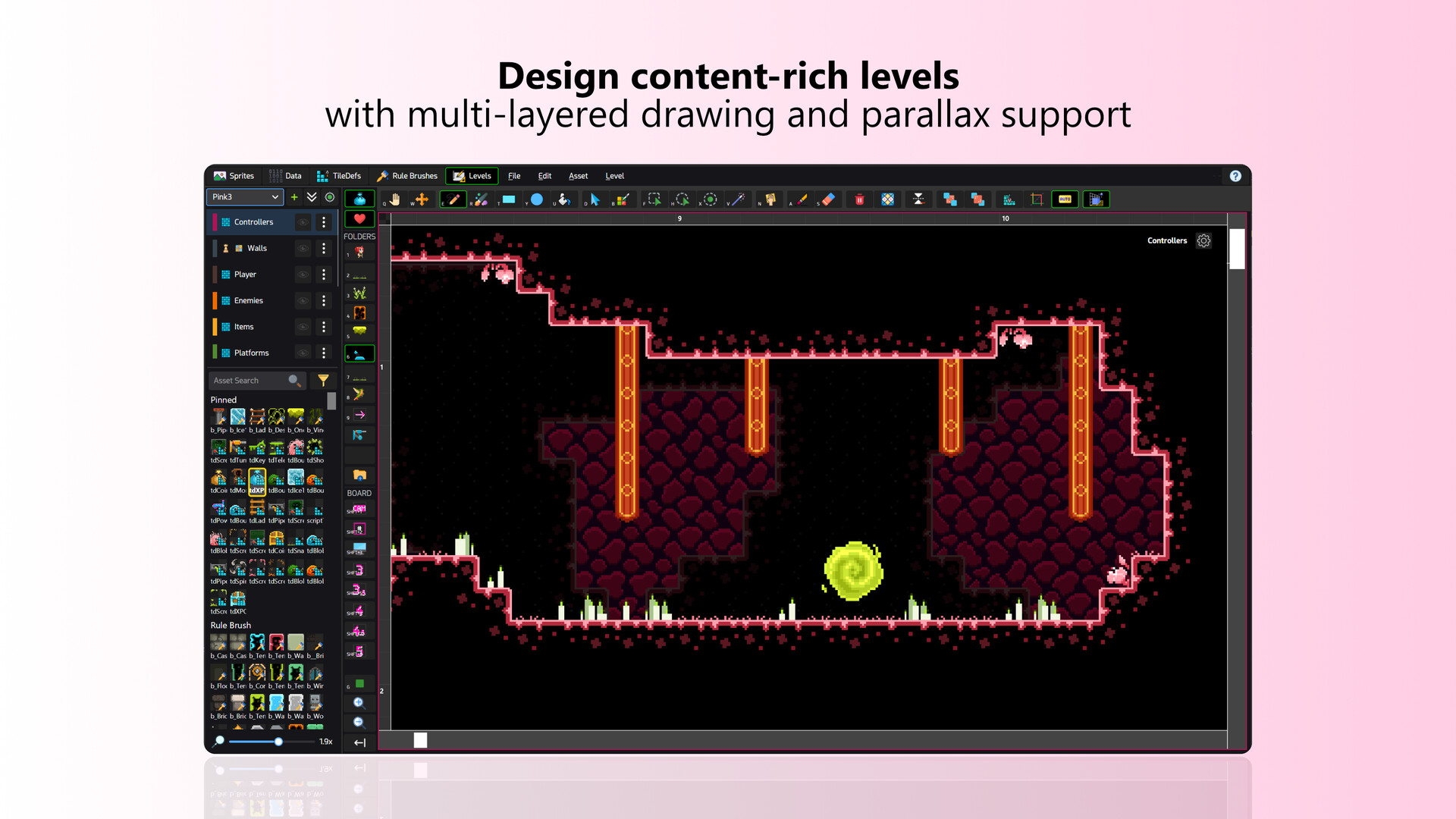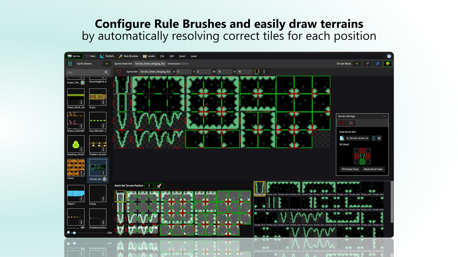 Set up rule-based brushes for terrains, platforms and other features by assigning rules to sprites, so the appropriate sprites are automatically chosen depending on their neighbors. Built-in support for bitmasking, 47-tiles and 4x4 tiles terrains. Draw or erase large areas with thick brushes, quickly creating levels.