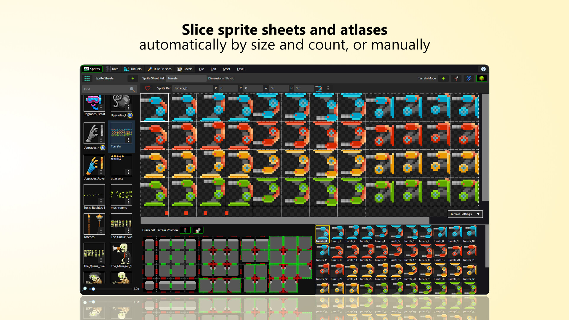 Import and slice your sprite sheets, remove opaque backgrounds by specifying a key color and set up tile bitmasks and brushes right within the sprite sheet editor and export them to rule brushes.