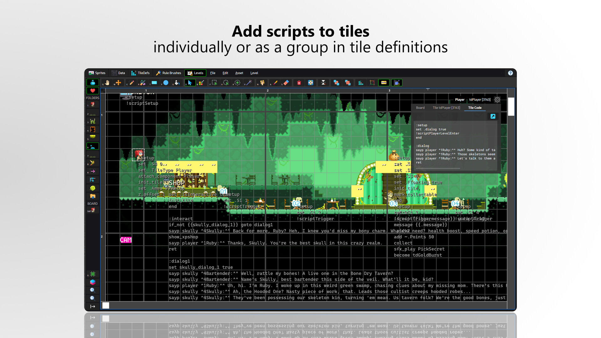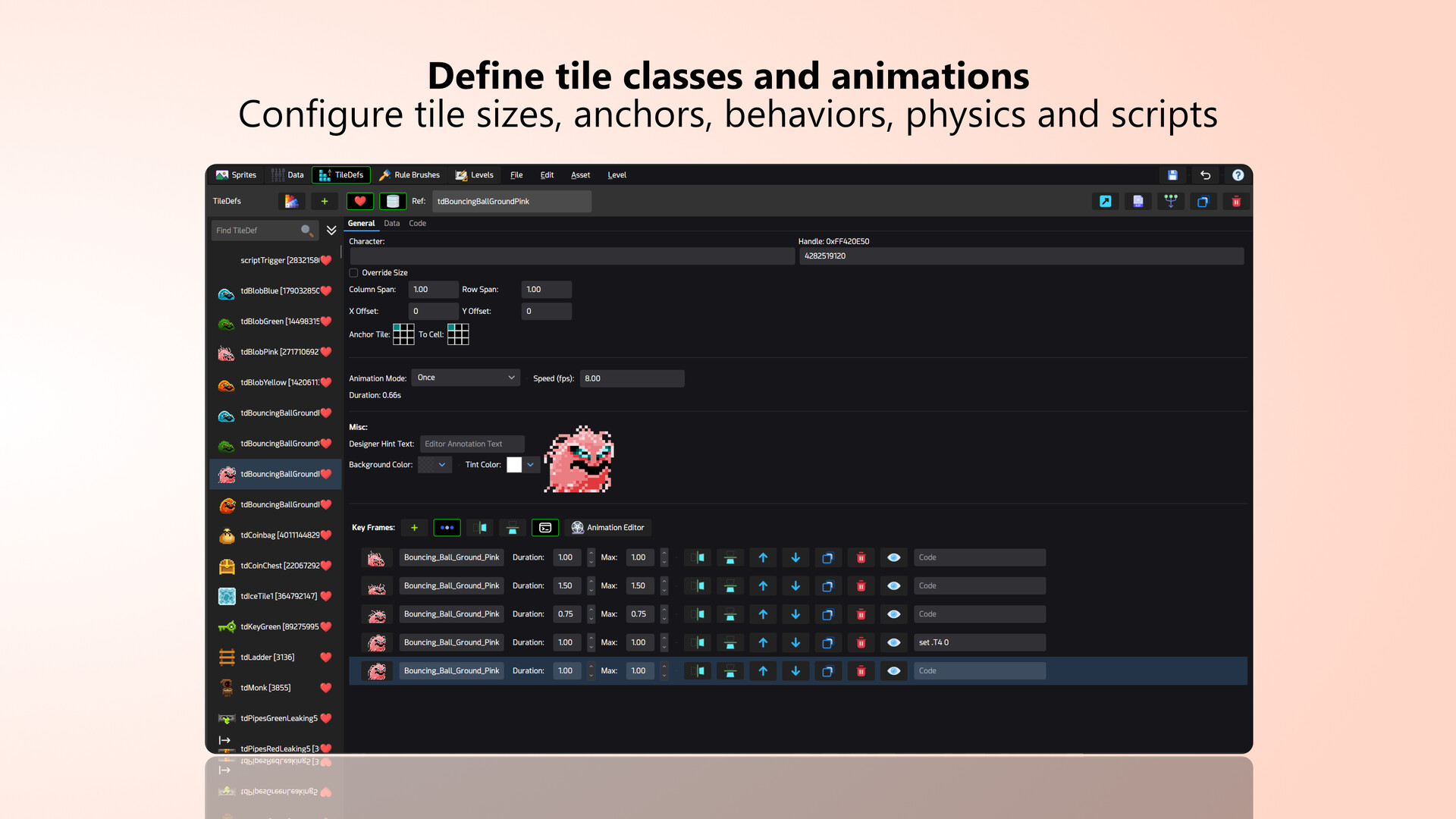 Set up tile definitions with various animation settings, background and tint colors and override their sizes and offsets on the grid. Additionally, you can assign variables and values to them and write custom scripts for tile definitions.
