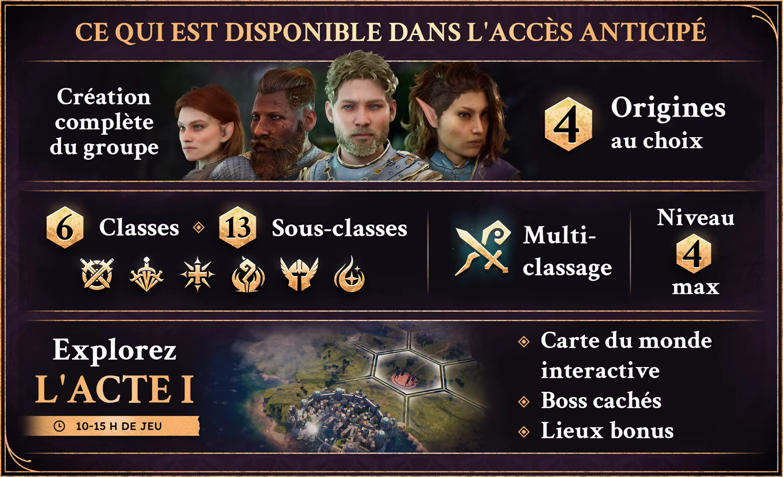La création de personnage débutera avec 6 classes et 4 origines. D'autres suivront avec les prochaines mises à jour de l'accès anticipé.  »