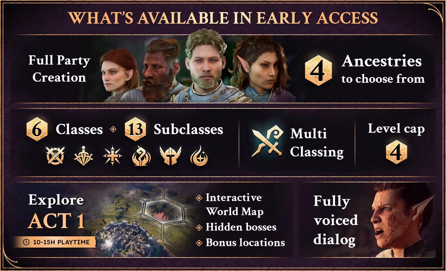 「The Early Access version of Solasta II will include a portion of Act I with a max level cap of 4. You will be able to create your party, play the beginning of the game, and explore a portion of the World Map - which is still in a fairly early stage of development and will thus receive many upgrades over time.