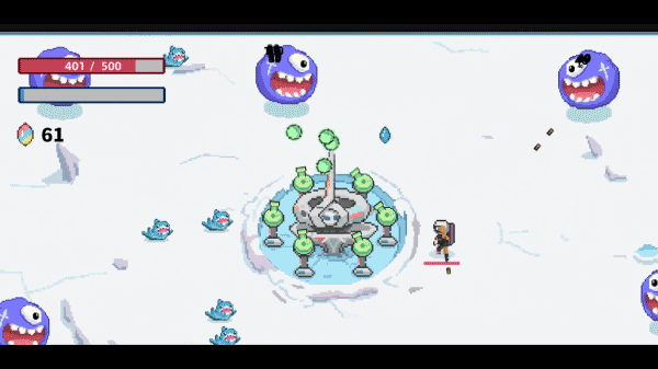This is a top-down angle tower defense Rogue game with an alien planet as the background. Players need to play as an astronaut who has just landed on a different planet, install weapons on the spacecraft, resist incoming alien native creatures, and obtain the gemstones contained in their bodies to strengthen their equipment.