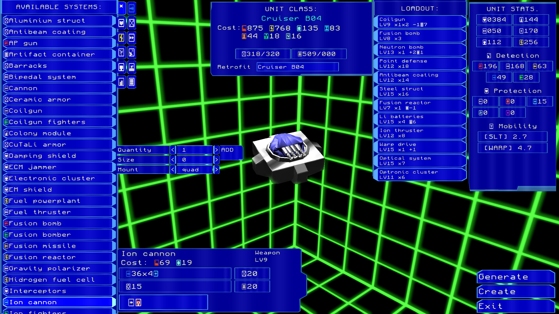 HARD VOID allows the design of your own spaceships with the selection of multiple ship systems: Weapons, Defense modules, Power sources, Sensors and more. Each ship system can be further customized with several parameters.