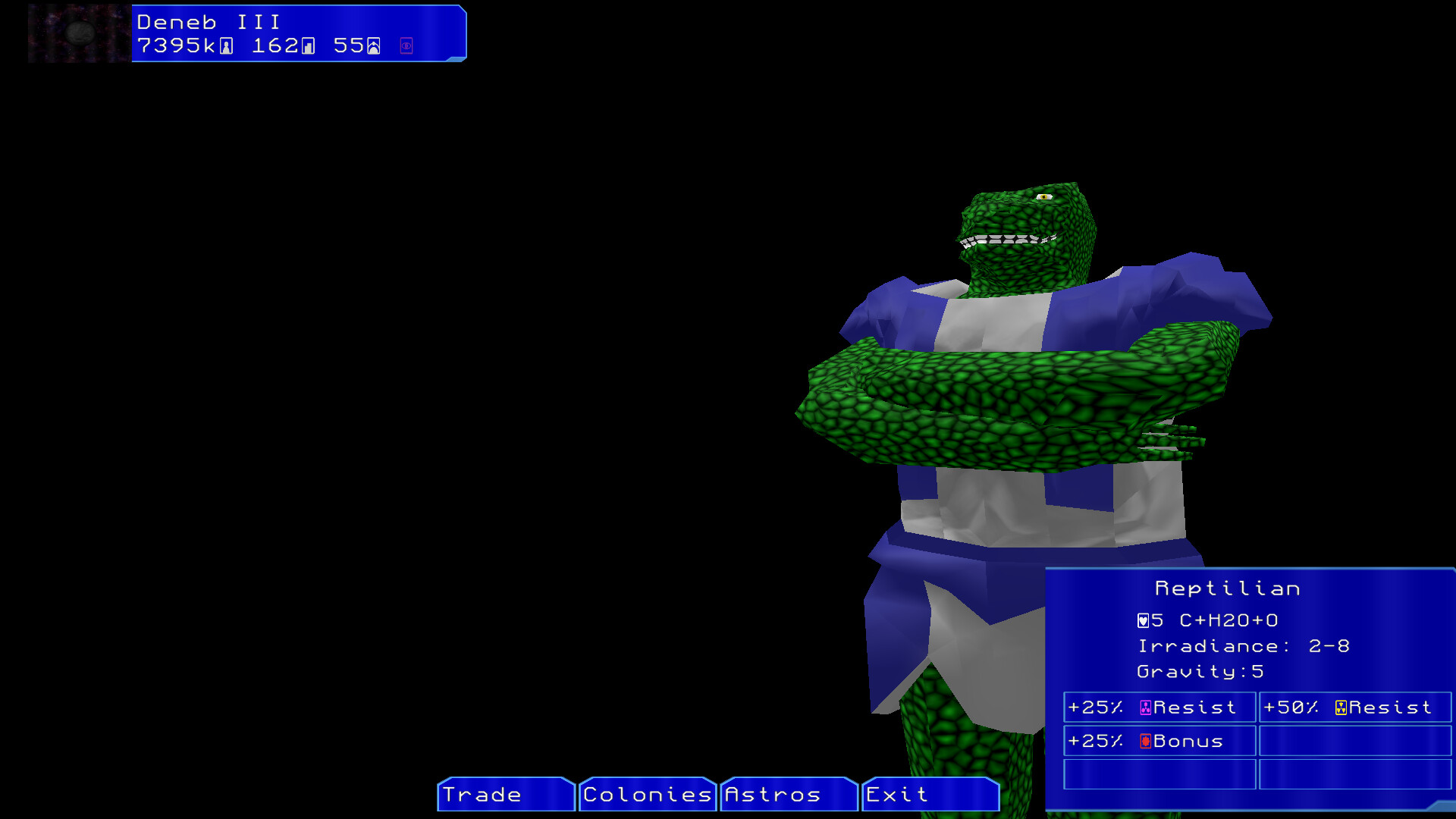 Manage efficiently your empire colony's industrial output in a complex multiple resource economy: Iron, Copper, Hydrocarbon, energy, and many more. Establish new colonies, form trade routes and feed your extensive war machine to continue expansion and extermination.
