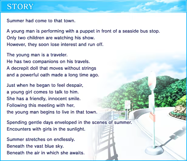Summer stretches on endlessly. Beneath the vast blue sky. Beneath the air in which she awaits— AIR, the second game released by visual novel studio Key, is now available on Steam! Now featuring the side story novel, "First Sky Chapter" and full voice support!