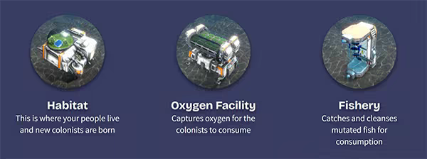 Habitats, Fisheries, Aircatchers, Markets, Schools, SeaWheat Farms, Aquaberry Farms, Bakeries, Metal Mines, Oil Rigs, Theatres, Torpedo Launchers, Fire Stations, Engineer Stations, Medical Facilities, and Import/Export Centres.