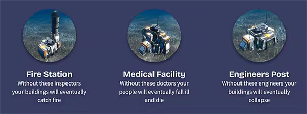 Life underwater is fragile. Fire, disease, flooding, and structural collapse are constant threats. Build specialized facilities to maintain order and safety: