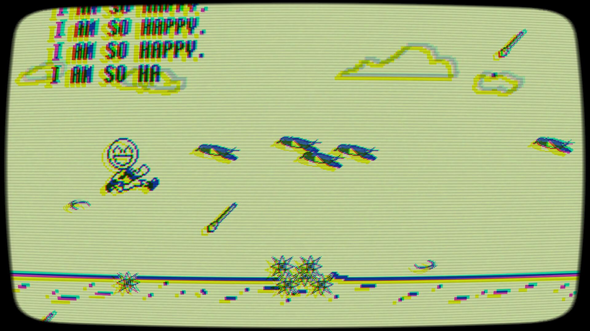A classic and severe one-button run game. It is a difficult stage, but if you keep saying "I AM SO HAPPY." you will survive. Even if you are not happy, you have to say you are happy to survive. It's just like modern society.