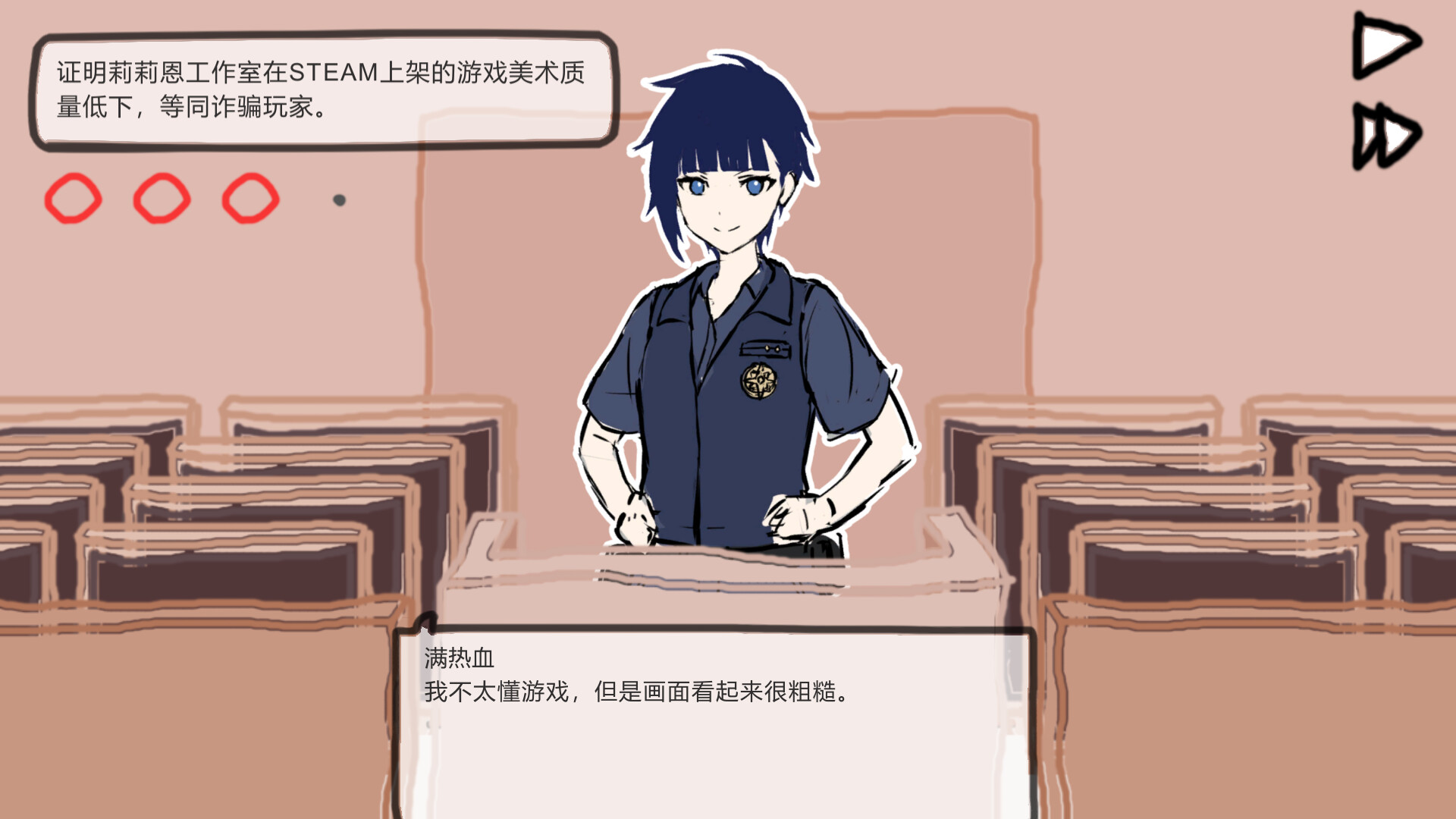 玩家将扮演一名检察官。 有恶质的游戏开发商以简陋的美术上架STEAM游戏。 玩家将在法庭上证明开发商的罪刑。 透过与检方证人合作,以正确的询问方式得到有利证词。 面对辩方的证人,出示手中的证据指出证词的矛盾。 以赢得庭审为目标,为大众伸张正义。