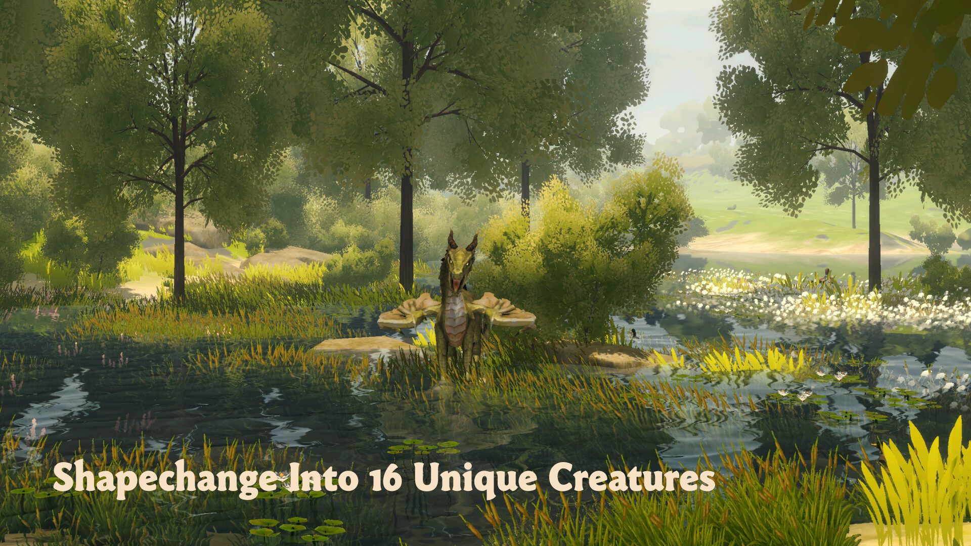 • Explore a serene, pastoral landscape filled with gentle rivers, peaceful lakes, rolling hills, and lush forests.