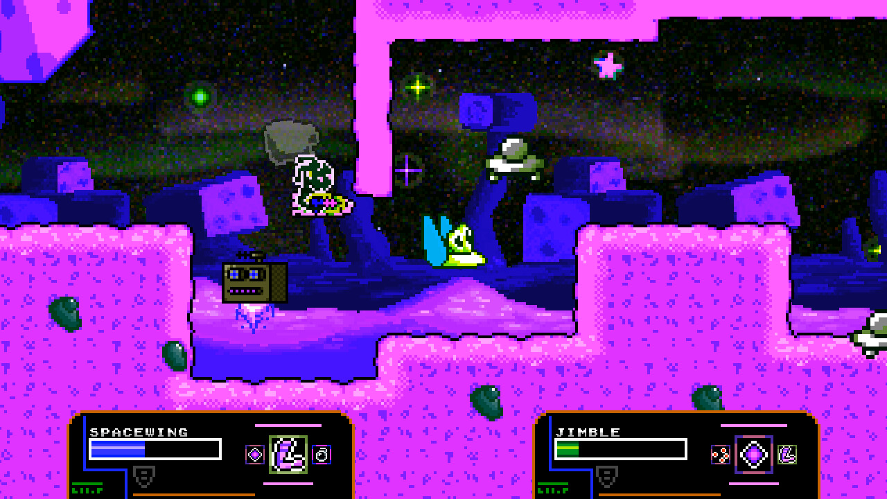 Spacewing is also joined by Jimble, an extraterrestrial bounty hunter who can be controlled by a second player at any time. Destroy your enemies as you make your way through a galaxy of wonders, and gather enough power to reach Energy Generators and uncover this conspiracy!