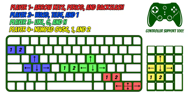 - Fight Your Friends: Up to four players can play via keyboard or controller in local PvP or virtually through a third party such as Parsec. Only XBOX or similar controllers are supported; button 1 is A, button 2 is B. Back is the Start button.