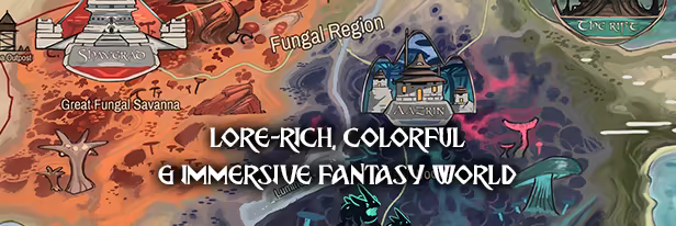 Explore Lyboria, a handcrafted medieval high-fantasy world. This vibrant realm spans diverse biomes - from fungal savannahs to icy mountains - and is rich with mythologies, chronicles, and histories. The world is bursting with color and life, yet grounded in mature themes woven through its art and character stories.