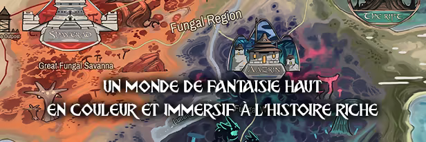 Explorez Lyboria, un monde médiéval de high fantasy artisanal. Ce royaume vibrant s'étend sur divers biomes – des savanes fongiques aux montagnes glacées – et est riche en mythologies, chroniques et histoires. Le monde déborde de couleurs et de vie, tout en restant ancré dans des thèmes matures tissés à travers son art et les histoires des personnages.