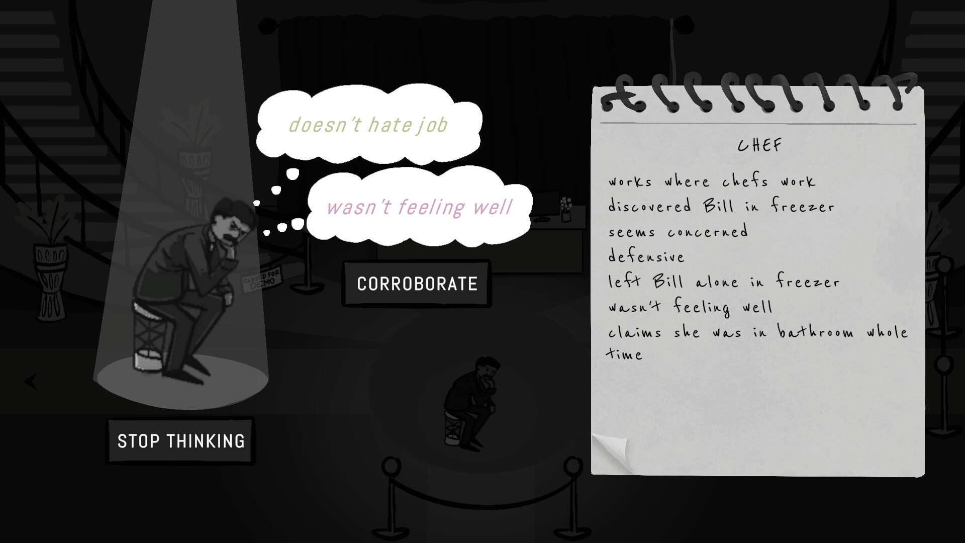 There are no freebies—no “click here to cast suspicion”. The player has nothing but their intuition (and a unique corroboration mechanic) to catch lies, solve puzzles, and unravel a cartoonish murder.