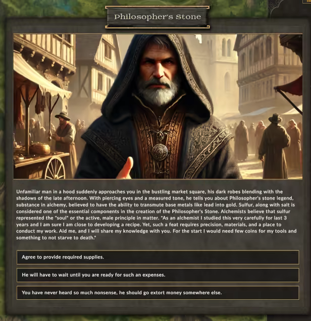 A complex crafting tree. Plan your strategy to make the most of the opportunities the game offers. Will you forge tools and weapons, or perhaps mint your own gold coins? You decide!