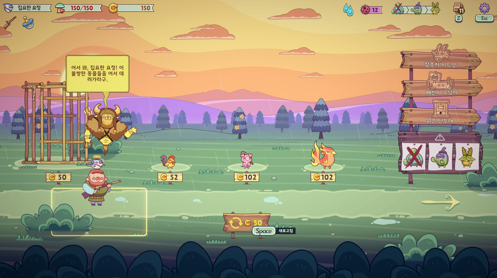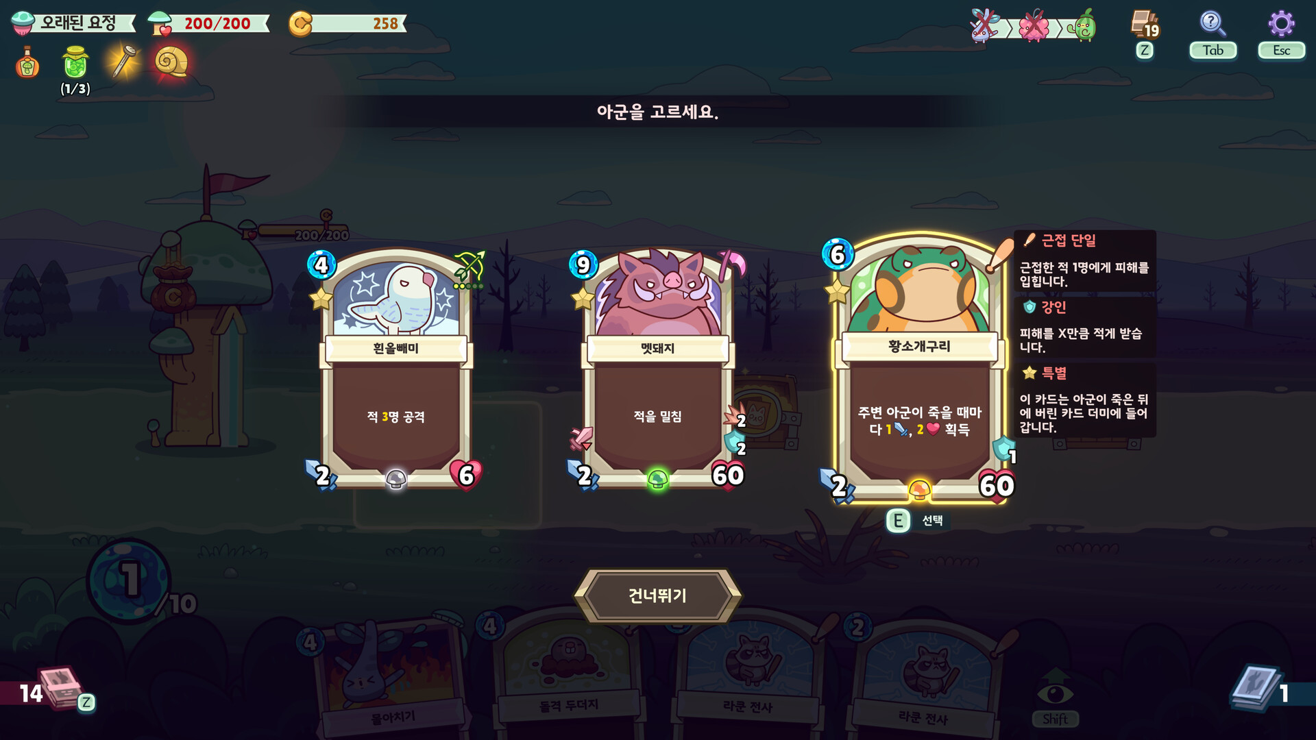 더 좋은 동물 카드를 획득하고, 강화 효과를 지닌 모자를 동물들에게 씌우세요. 요정 스킬 카드와 부적(=유물) 역시 승리를 위한 전략의 일부입니다!