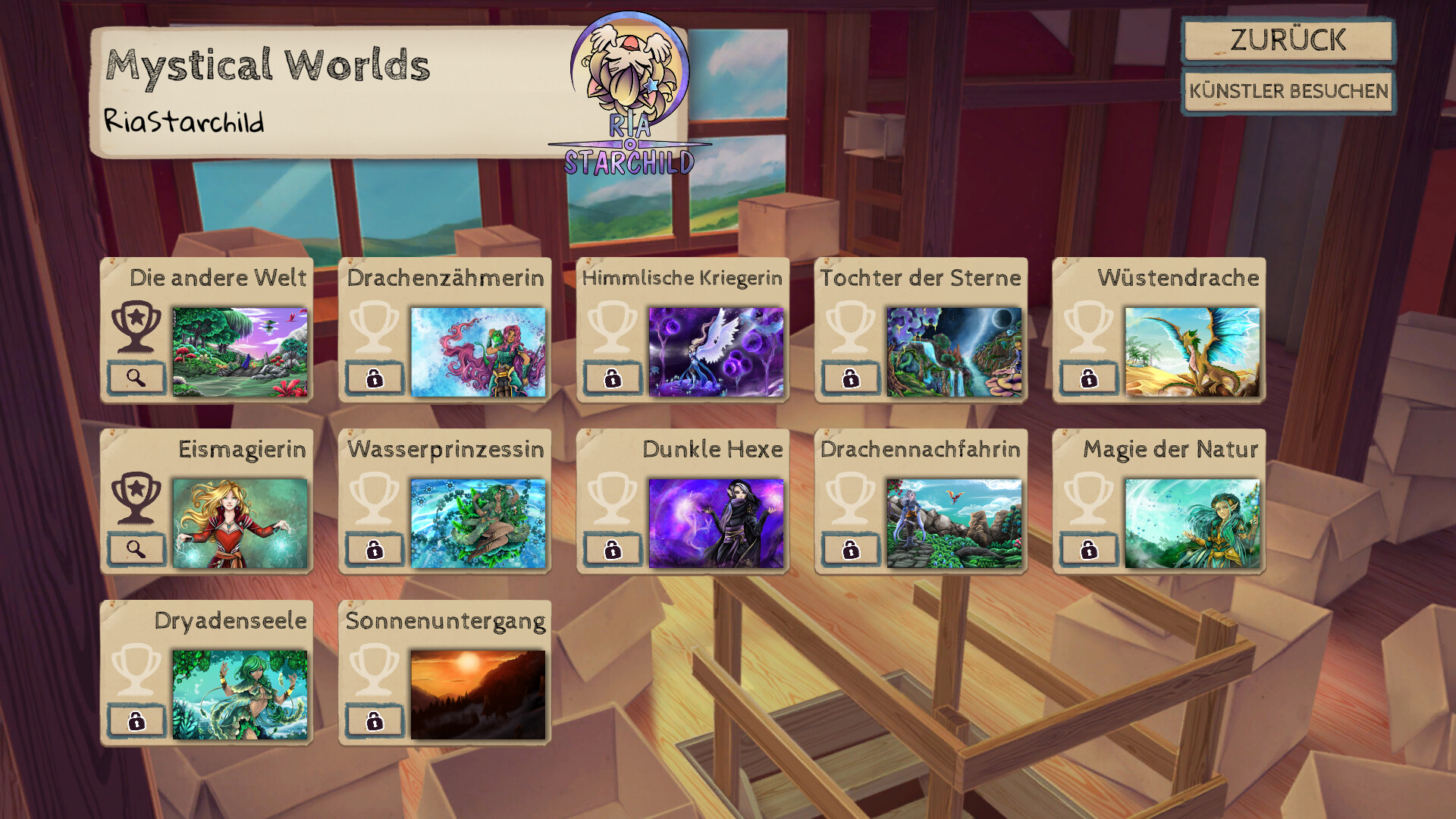 • 10 wunderschöne handgezeichnete Mystische Welten von RiaStarchild zum Puzzeln.