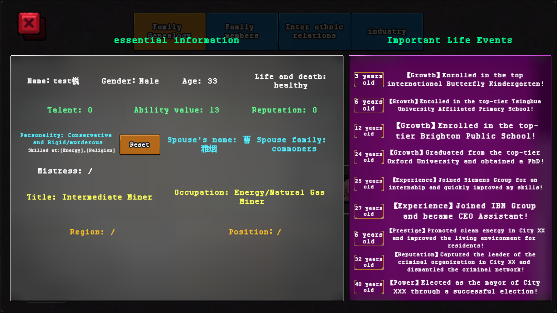 2. Your children start from birth, go through kindergarten to university education, gain workplace experience, take control of industries, accumulate reputation to run for city magistrate, and ultimately contribute to the growth of your family's power.
