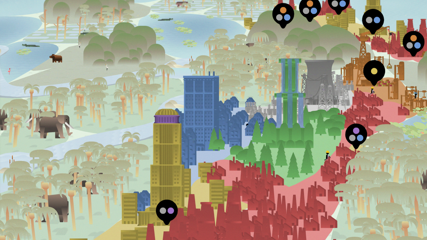 The world is your canvas. No complex systems. Simply select a district from your color palette and brush it across the land, instantly turning your strokes into bustling city districts.