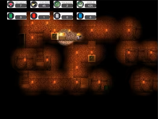 Find objects to advance. Pickaxes to defend yourself, medkits to recover energy, gold to collect and exchange for health and access cards to open doors and advance.