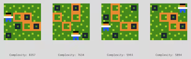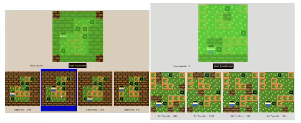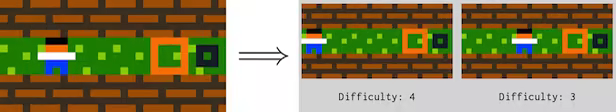 The final outcomes are then ranked according to their difficulty and presented to the designer. In this very simple example, the level where the player is moved to the right is considered slightly more difficult than the level where the player is moved to the right. The difficulty metric is based on the number of states the fastest solver requires in order to find the solution, and does not always match human judgement. The transformer works best if the ratio of interesting levels is high in the search space and the levels need a moderately low number of steps to be solved. The following are example use cases of using a transformer for designing Sokoban puzzle games, but the techniques apply to other puzzle games.