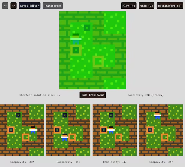 The transformer can be used to polish certain things at the end, like finding the most difficult starting position of the player in a Sokoban level. Also, an often reoccurring problem is to know when to stop designing a level. The transformer can give you a level of confidence if it cannot find any simple transformations that would make the level significantly more interesting.