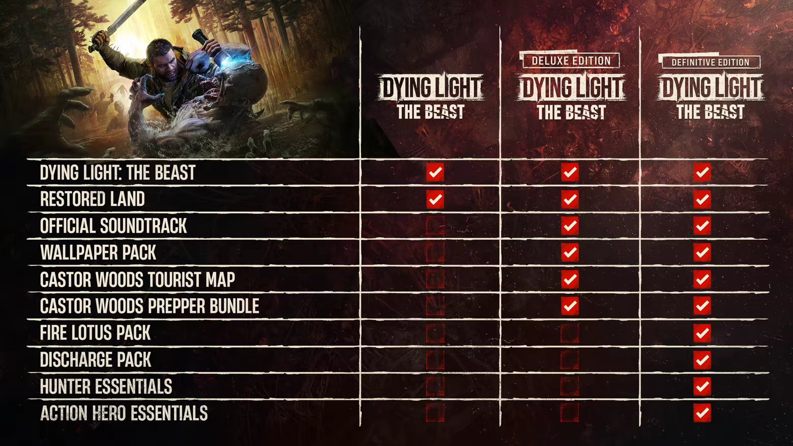 Tauche mit der Deluxe Edition noch tiefer in die Welt von Dying Light: The Beast ein. Darin enthalten sind der offizielle Soundtrack, Hintergrundbilder und das Prepper-Bundle aus Castor Woods sowie eine detaillierte Touristenkarte, in der die wichtigsten Orte verzeichnet sind, die es zu erkunden gilt.