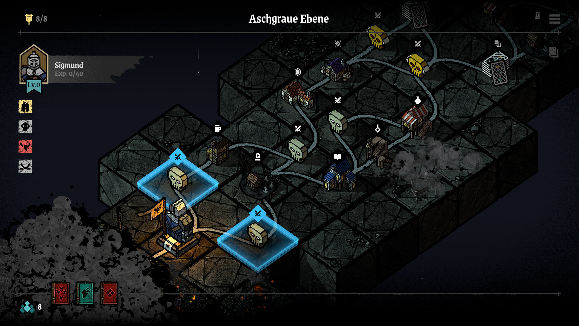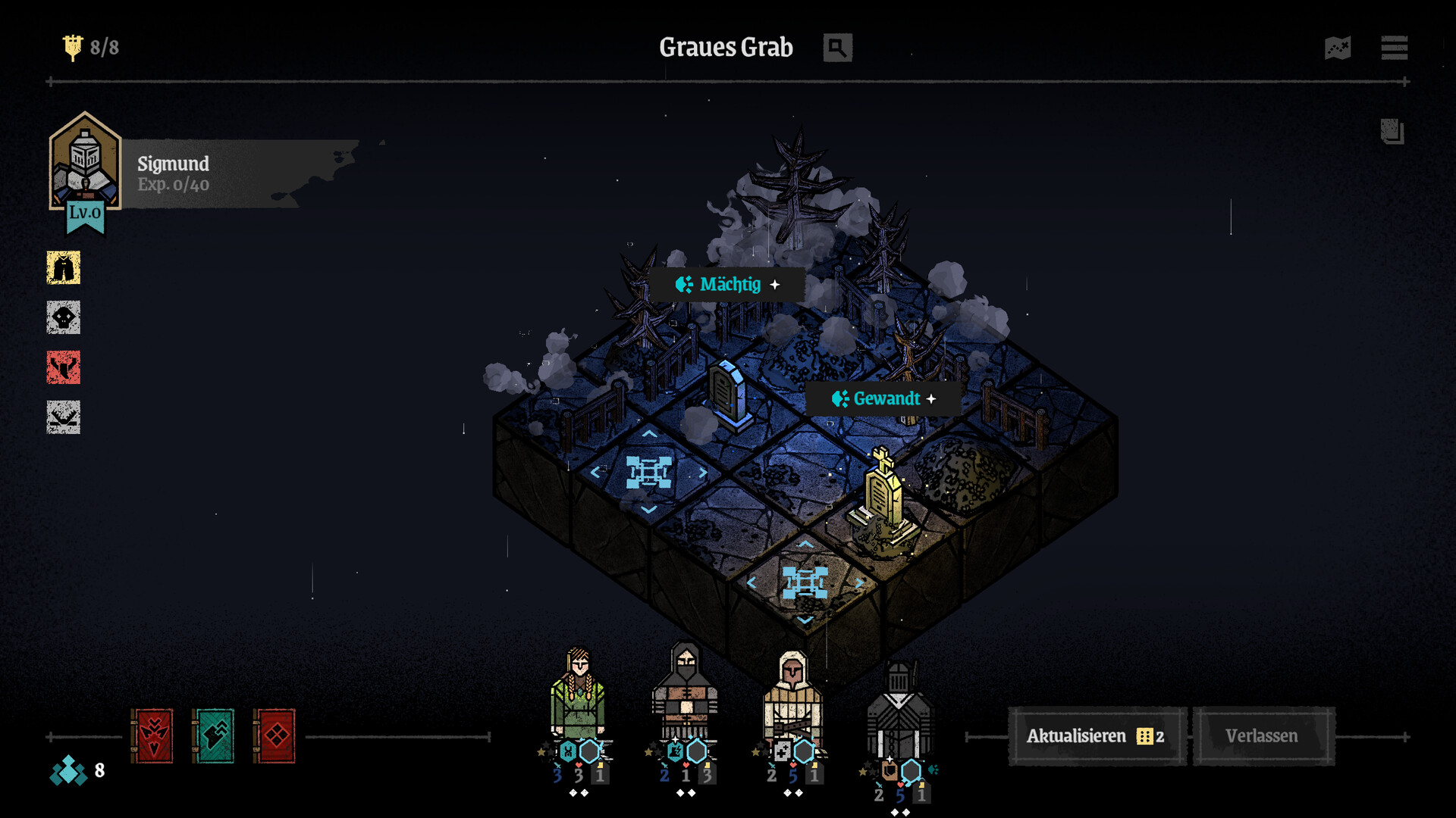 Besuche die verschiedenen Gebäude in jeder Region, um dich auf die kommenden Kämpfe gegen mächtige Feinde vorzubereiten. Kombiniere Eigenschaften, entlasse unnötige Söldner und kaufe Relikte und Gegenstände, um deine Strategie zu verfeinern.