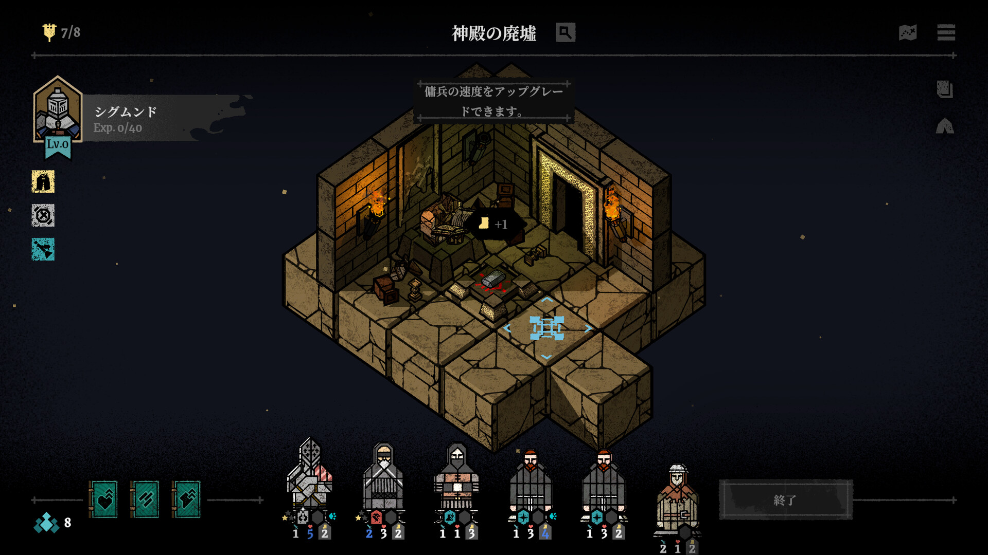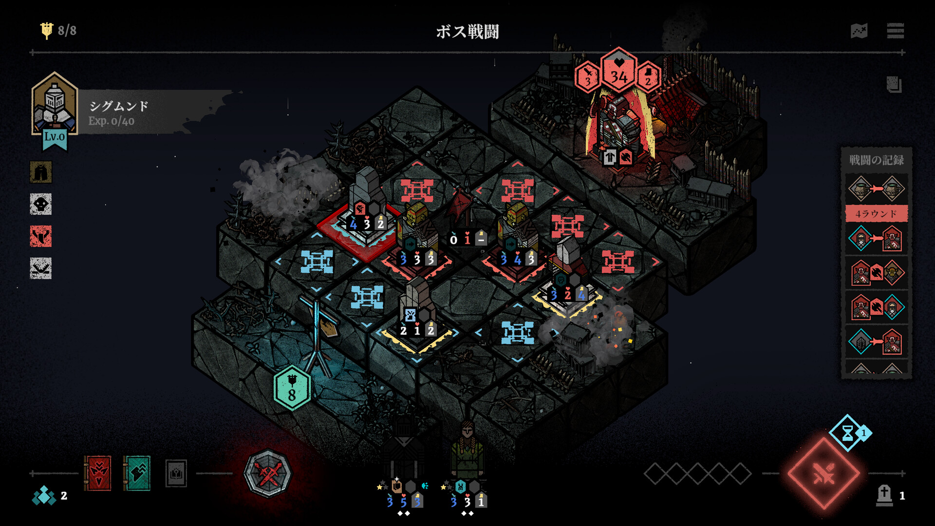 各ラウンドでは、アクションポイントを消費して傭兵を戦場に配置します。戦闘が始まると、傭兵たちは速度の順に自動で行動するため、配置の段階で最適な布陣を見極めることが重要です。