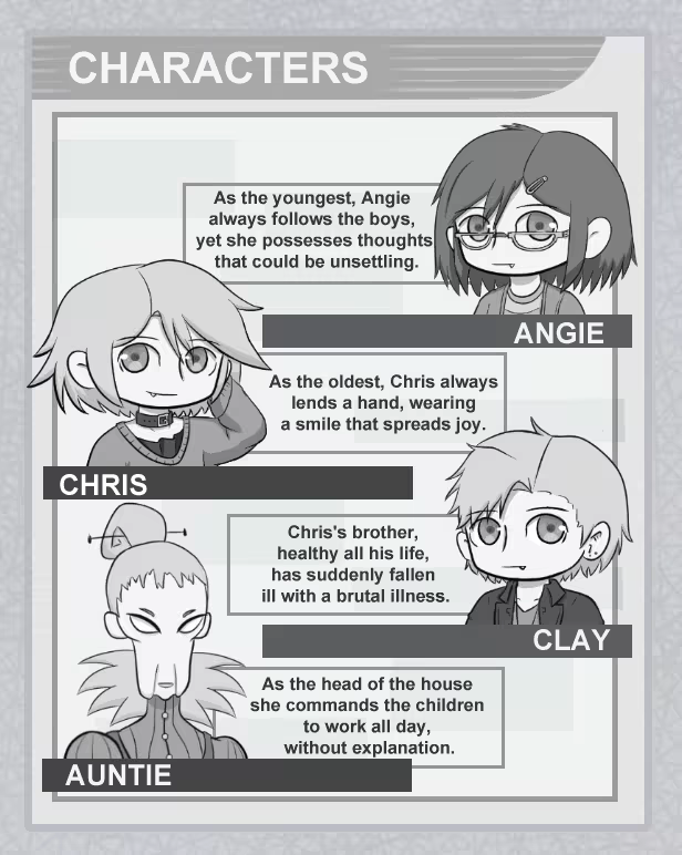 (Text Base Adventure Visual Novel) Input via text with VN graphics. Waking up in a mysterious field, you find yourself invited into a quaint house overseen by a gaunt old lady and her children. Yet, an unsettling feeling grows. The house's rules, seemingly straightforward, begin to unravel.