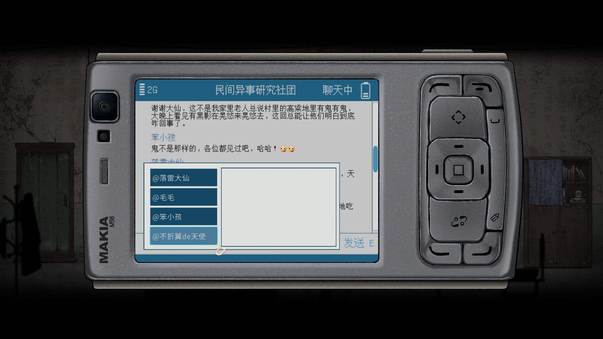 在推理结论成功合成之后,有概率会出现“提问关键词”,这时玩家便可使用手机进入民间异事研究社团的群聊中,根据群聊成员的对话,选择正确的提问人,并且匹配相关提问关键词,获得更多信息。
