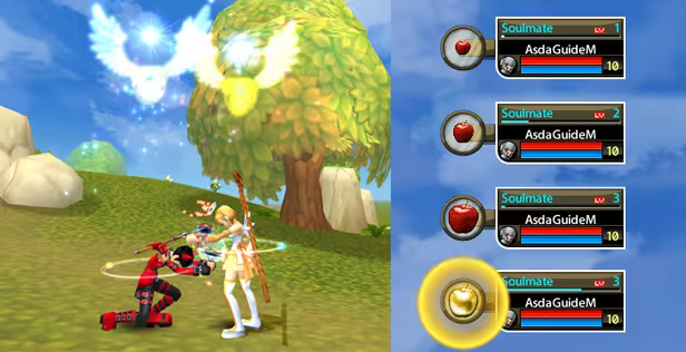 Become soulmates with another player and grow even stronger together! Level up together and gain exclusive skills unique to soulmates, such as the ability to teleport to, summon, heal, and revive each other! Other skills will increase your strength as you play together and prevent the loss of experience upon death. Kill 100 monsters together to earn a Golden Apple, which grants extra experience and items!