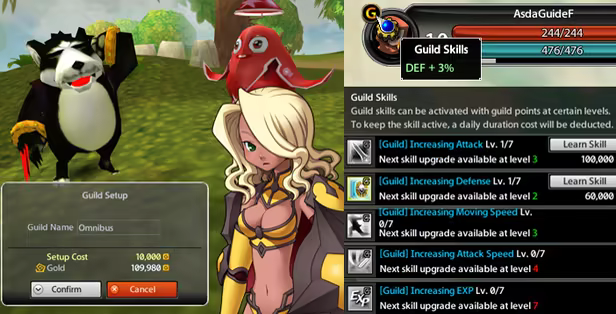 Create or join a guild and work together to earn great rewards! Gather guild points from various activities, such as killing monsters, questing, digging, fishing, crafting, gaining titles, and more. Donate these points to your guild to help it level up, allowing your guild to grow larger and unlocking access to guild buffs that increase your power, speed, and experience!