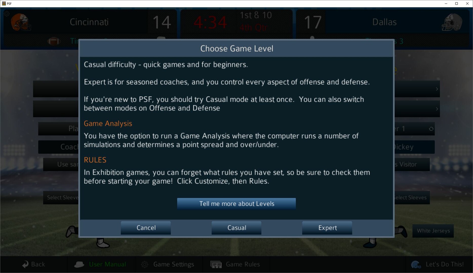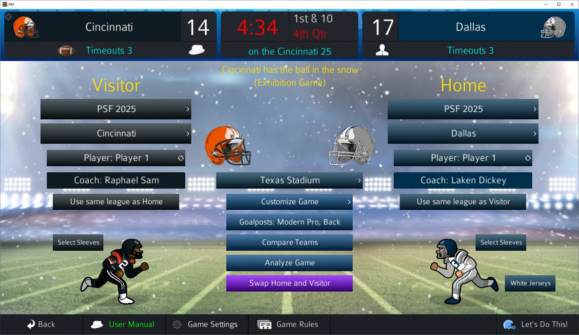 BUT PSF doesn't box you in! You can change rules, tweak injuries and penalties and other realism settings, and choose how YOU want to play the game. The game is highly customizable, and you can run the whole league as a commissioner, play behind the scenes as a GM for one or more teams, coach from the sidelines, or even watch games in the stands as an observer – and you can play any or all of these roles at any time.