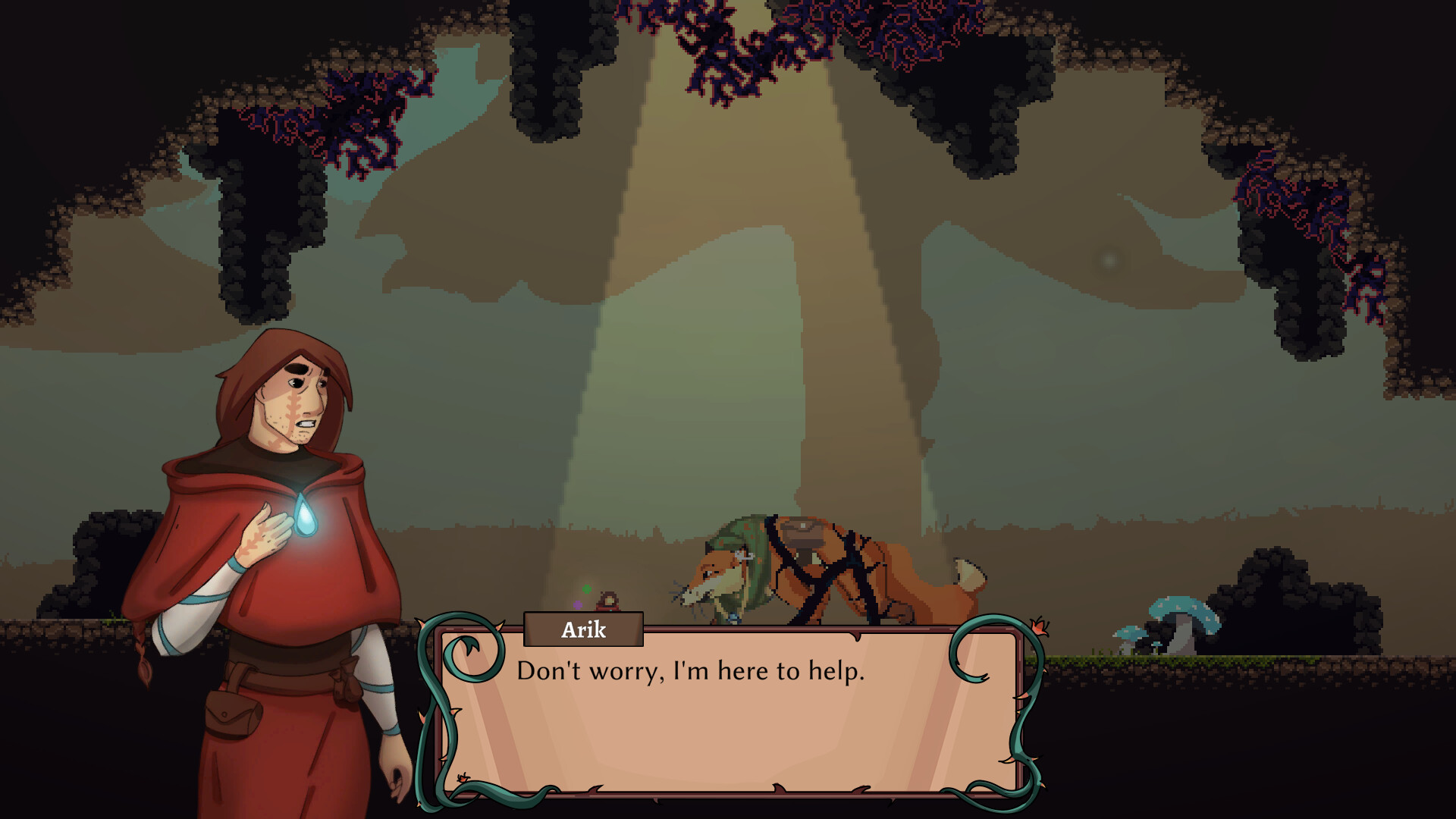 Oprost is a journey of grief through a precision platformer that uses power of animal moves instead of classic jumping. Help Arik, a druid who recently lost his wife, in battling his grief as well as the beast of thorns and weeds who is destroying his forest.