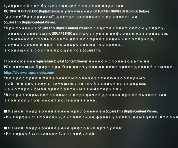 Этот комплект включает в себя основную игру OCTOPATH TRAVELER 0, набор Deluxe Travel Provisions и цифровой альбом эскизов.