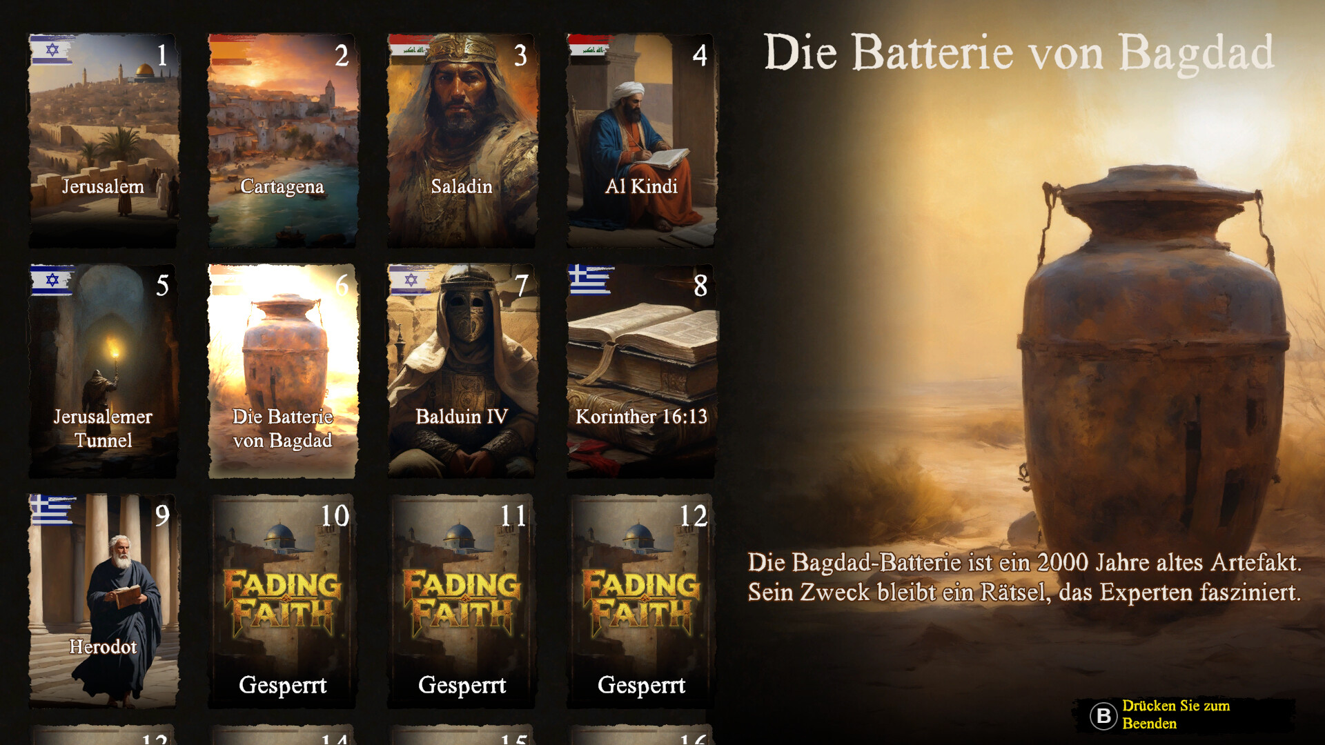 Evokative Bilder für die 'DungeonPedia' wurden mit Stable Diffusion 1.0 erstellt, die die Essenz des alten Sumer, der griechischen Zivilisation und der Atmosphäre des Jerusalems der Kreuzfahrer einfangen. Diese wurden dann in Photoshop sorgfältig verbessert, was zu einem unverwechselbaren, handgemalten Stil für jedes Element führte.