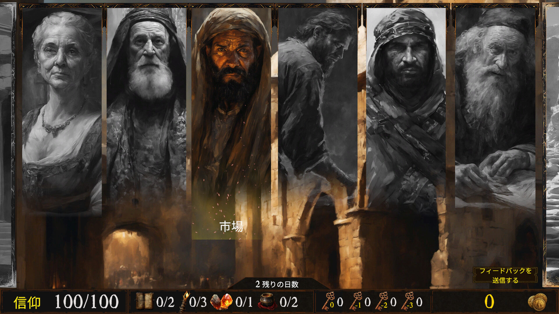 エルサレムでは地元民が親切を装い、装備の交渉や精神を高めるための施し、または融資の提供を申し出る—しかし彼らの強欲があなたの金への渇望を搾取し、価格を上げたり追放したりし、さらなるものへの絶望を残す。